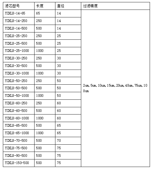 圓柱形濾芯型號(hào)匯總表